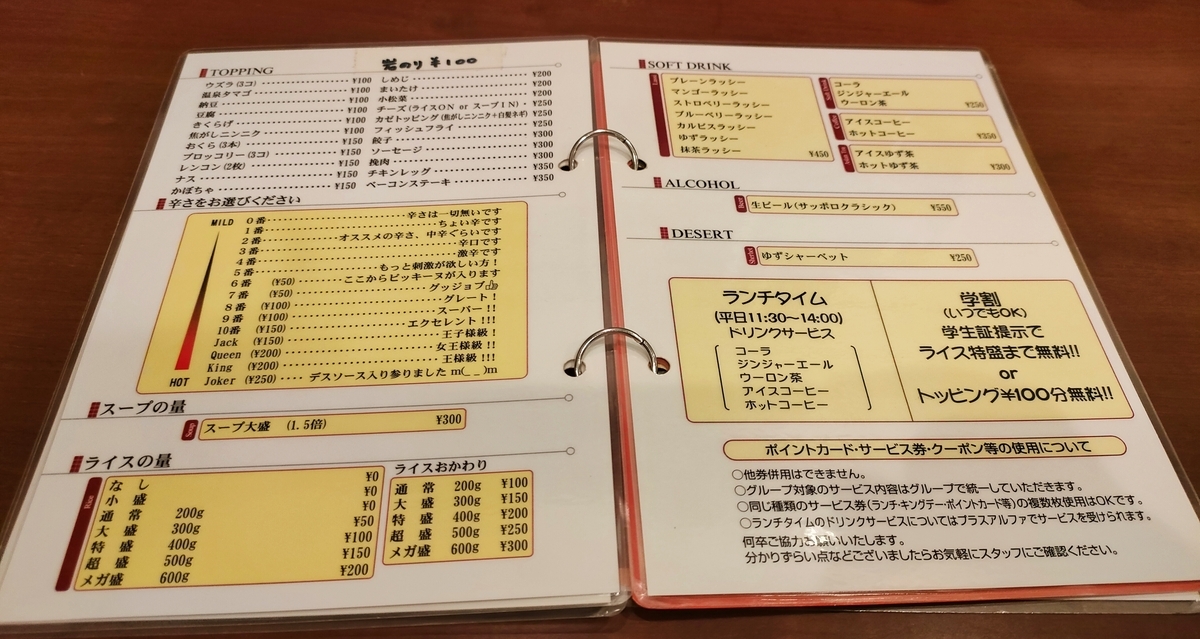 さらにトッピング、辛さ(15段階、0~Jokerまで)、ご飯の量(なし~メガ盛まで)、ドリンクを決めます。